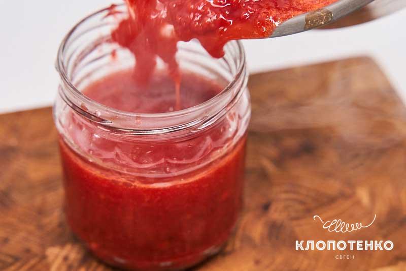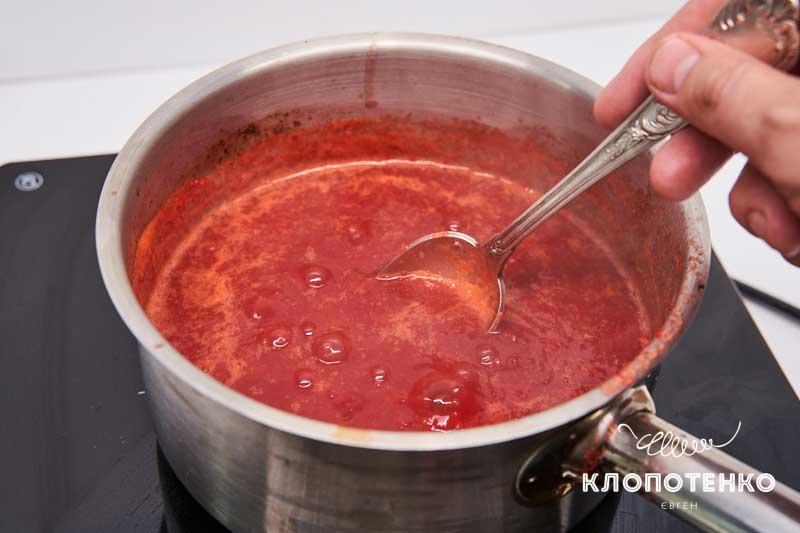 Перелийте отриману суміш у сотейник, додайте 1 ст. л. цукру та 1 ч. л. солі. Варіть на невеличкому вогні приблизно 40 хвилин чи 1 годину. Час залежить від того, яку консистенцію ви хочете отримати – більш рідку чи густішу. Додайте 2 ст. л. оцту та трохи перемішайте.