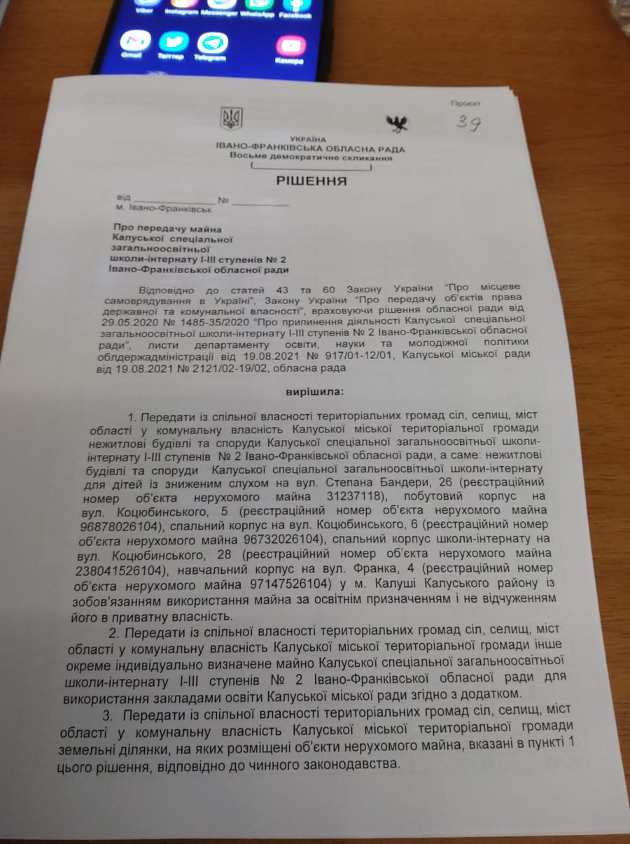 "Щойно обласна рада прийняла рішення щодо передачі комплексу колишньої Калуської школи-інтернату нашій громаді! Вітаю всі причетних і дякую колегам-депутатам! Тепер справа за Калуською міською радою!" — написав у соцмережі депутат обласної ради Ігор Очкур.