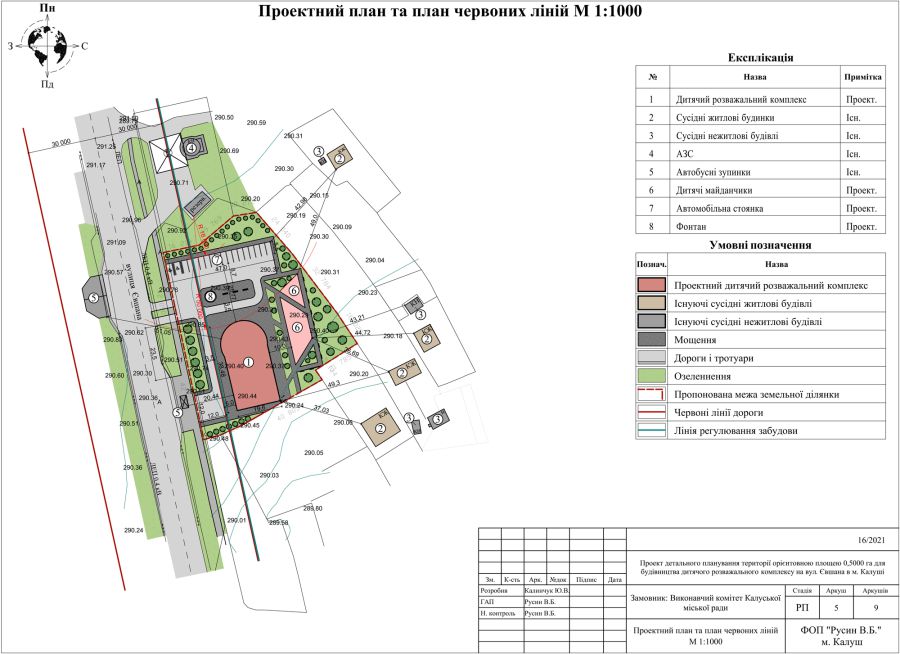 За документацією, яку затвердила міська рада, на охопленій проектом детального плану території передбачено будівництво дитячого розважального комплексу, влаштування зелених зон, дитячих майданчиків та автомобільної стоянки на 18 автомобілів. Максимальна поверховість будівлі дитячого розважального комплексу — 4 поверхи. Площа забудови земельної ділянки — 997 кв. метрів, що близько 20% від її площі.
