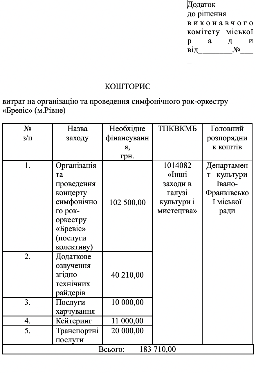 На сайті виконкому оприлюднений кошторис на виступ симфонічного оркестру Brevis з Рівного. На організацію, озвучення, кейтеринг, харчування та транспортні послуги виконавцям місто потратило 183 710 грн, з яких 102 500 грн — гонорар артистам.