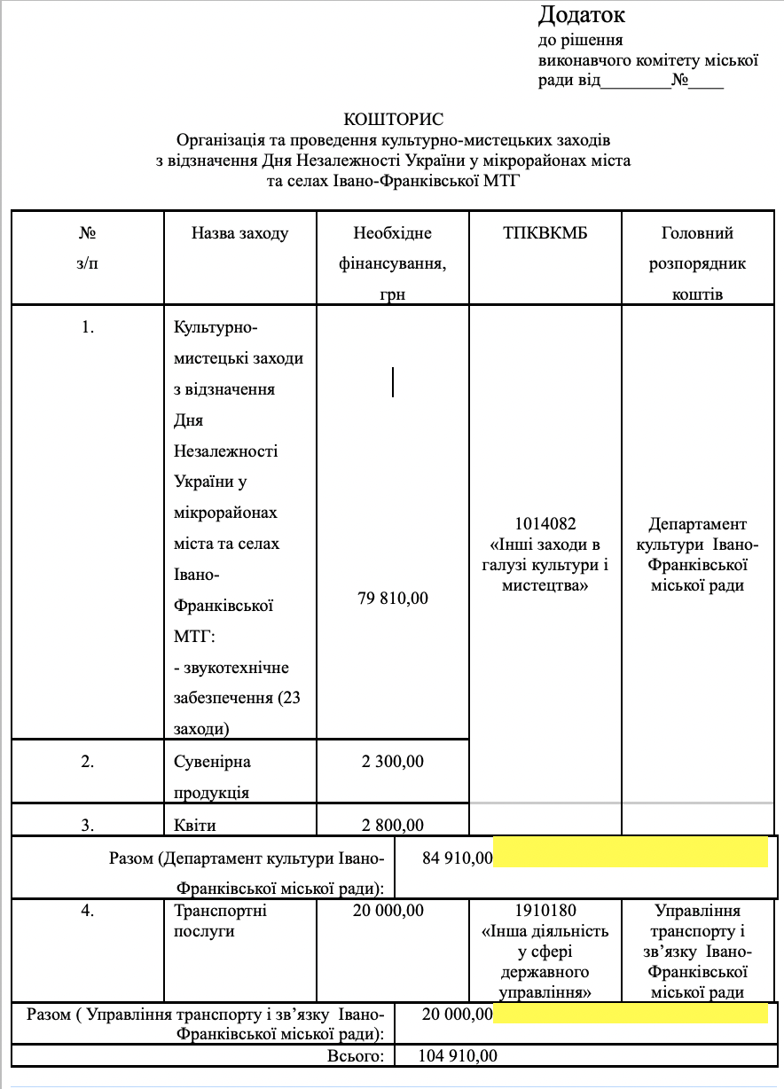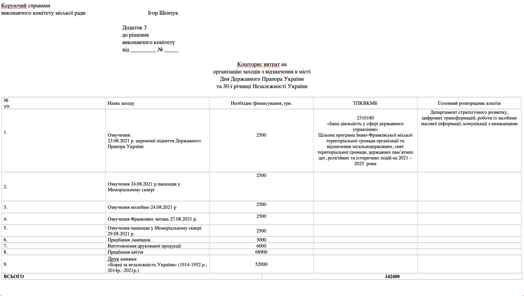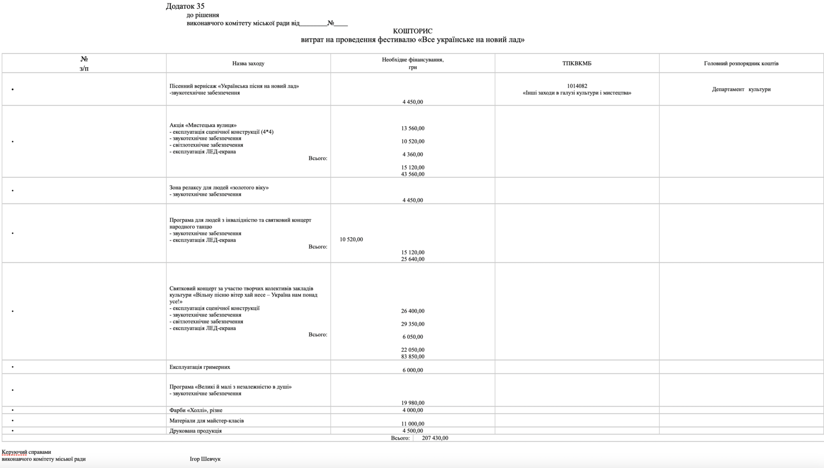 У рішенні №1183 міський голова Руслан Марцінків знову розпоряджається про виділення коштів у сумі 49 500 грн на організацію та проведення заходів у Франківську, проте на які цілі спрямована дана сума не згадується. Зате знаходимо повний кошторис витрат на проведення фестивалю «Все українське на новий лад», який стартував у місті 23 серпня. Фестиваль пройшов на кількох локаціях, а саме на пішохідній зоні вулиці Незалежності, площі Міцкевича і її прилеглих вулицях, міському парку культури ім. Т. Шевченка, Вічевому майдані, а також мікрорайонах міста. На все це з міської казни спрямовано ще 207 430 грн.