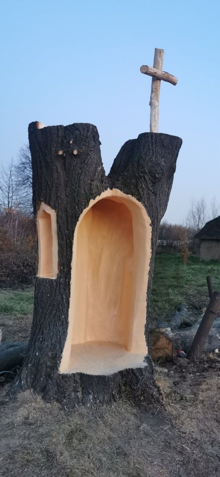 «Ми їхали, бачимо, липу ріжуть на кубани. Зупинили процес, впросили, щоб зробити з цього щось важливіше. Словом, пізніше працював я над цим сім днів. Зараз господарі ділянки вже працюють над дахом до каплиці. Плануємо, щоб всередині була Матір Божа і блакитна арка», — каже митець.