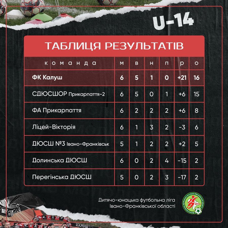 По завершенні першого кола у віковій категорії до 14 років юніорська команда ФК "Калуш" вирвалася в лідери ДЮФЛ Івано-Франківської області, інформують "Вікна".