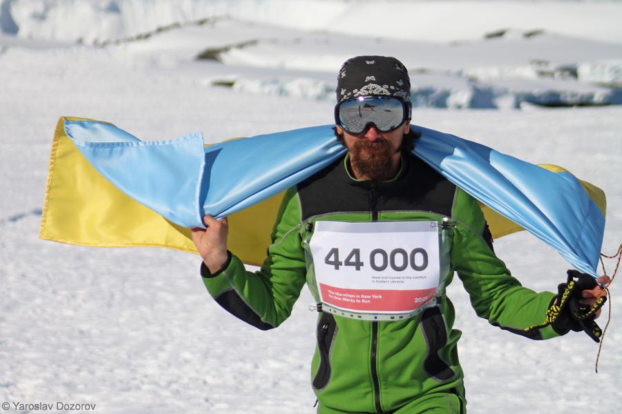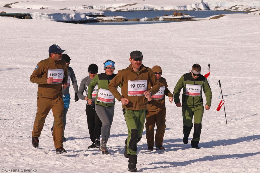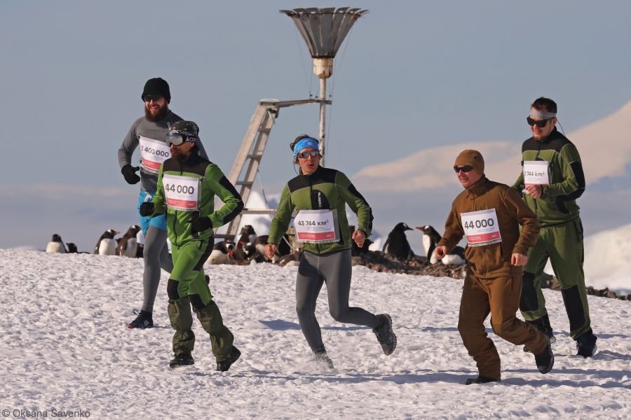 Вісім зимівників пробігли символічне коло навколо будівлі аерології — це близько 400 метрів. Але навіть така дистанція в Антарктиді є непростою для марафону, адже бігти довелося нерівною слизькою поверхнею (пінгвіни “постаралися” натоптати цікаву трасу для полярників. Замість стартових номерів учасники мали аркуші з вражаючими цифрами про війну. Наприклад, що 3,4 млн людей на сході України потребують безперервної гуманітарної допомоги.