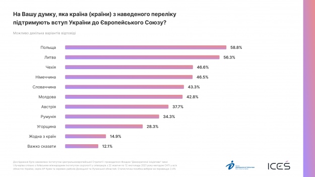 Угорщина також опинилася на останньому місці серед країн Центральної Європи які, на думку українців, підтримують вступ України до ЄС. Серед тих, хто підтримує євроінтеграцію України, найчастіше назвали Польщу та Литву.