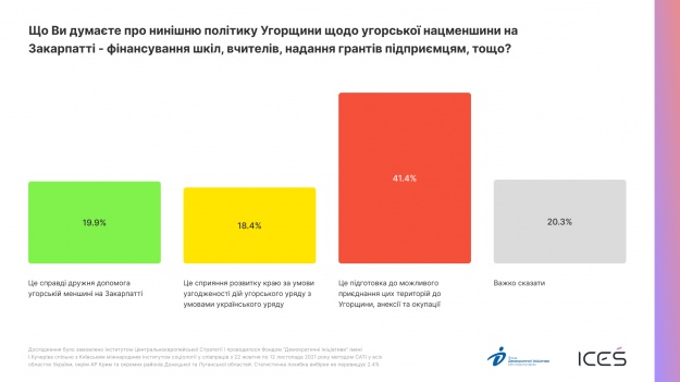 Так, 41,4% респондентів вважають нинішню політику Угорщини щодо нацменшини на Закарпатті — фінансування шкіл, гранти для підприємців тощо — "підготовкою до можливого приєднання цих територій до Угорщини".