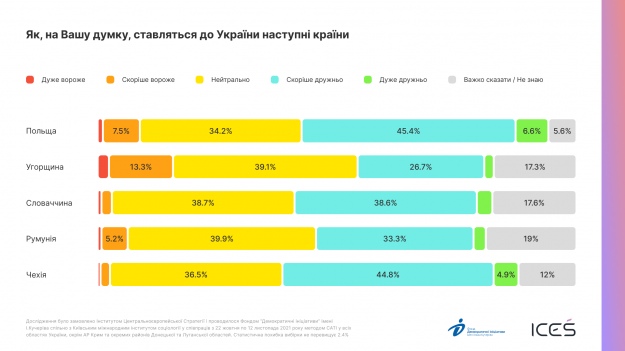 При цьому абсолютна більшість респондентів не вважають, що Угорщина вороже ставиться до України — така думка щодо Угорщини більш поширена, ніж щодо інших центральноєвропейських сусідів, проте її ставлення до України "ворожим" або "дуже ворожим" вважають лише 15,5%, тоді як дружнім — 28%.
