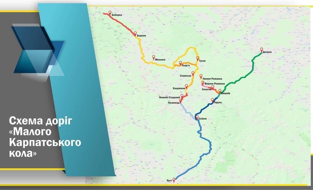 Довідка. «Мале карпатське коло» — спільний проєкт обласних влад Закарпатської, Львівської та Івано-Франківської областей разом з «Укравтодором» щодо розбудови доріг у центральній частині Українських Карпат. У грудні 2019 року проєкт було презентовано та підписано відповідний меморандум. У лютому 2021 року майбутній державний інвестиційний проєкт «Мале карпатське коло» було презентовано як частину програми президента України «Велике будівництво».