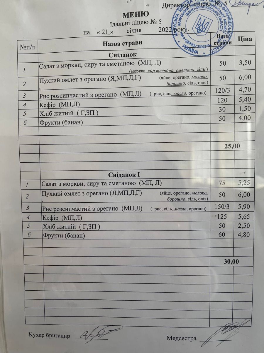 Вартість порції для учнів 3-4-х класів також становить 25 гривень. Діти замовляли вареники, картоплю з котлетою, макарон тощо. Проте цих страв не було у затвердженому меню, та і фруктів, соків також дітям ніхто не давав, акцентувала Надя Гуш.