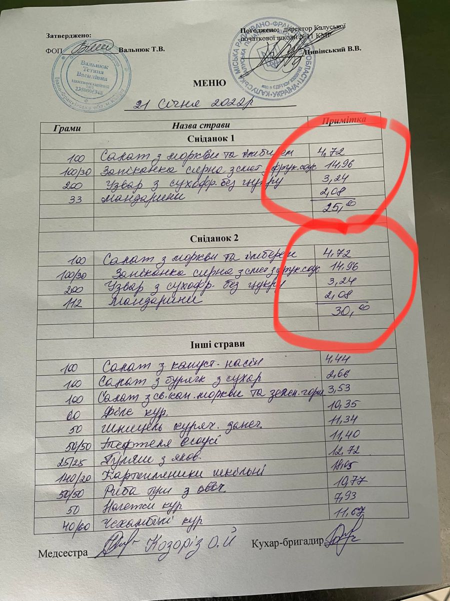 За словами посадовиці, учні 1-2-х класів харчувались відповідно до оновленого меню на суму 25 гривень. У раціоні були овочі, фрукти, кефір, сік.