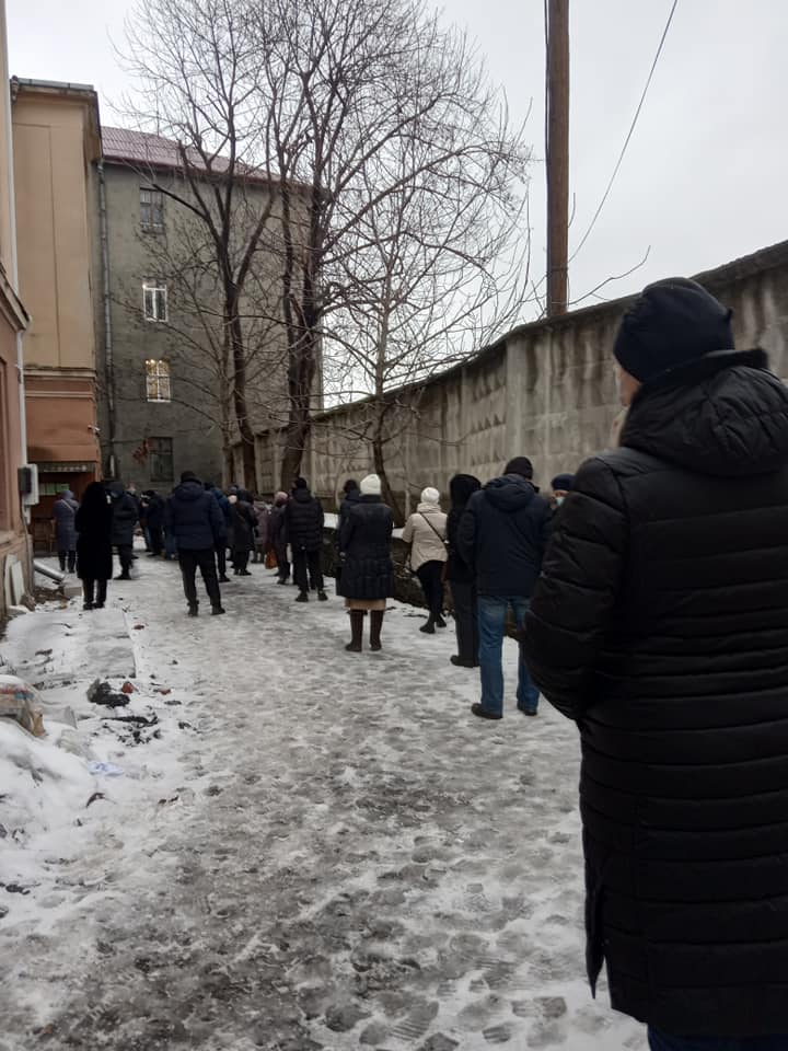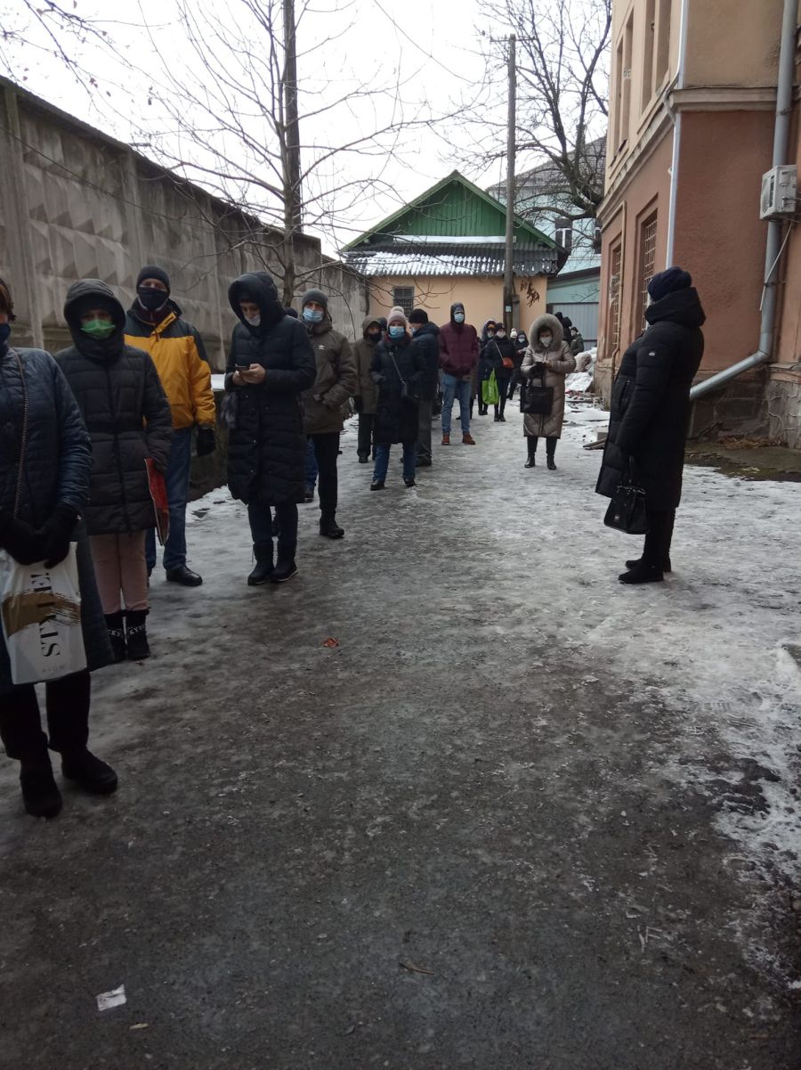 “30 хвилин на десяту. Моє місце в черзі під тим дальнім стовпом. Врахуйте, що в основному стоять хворі люди. І хоч морозу нема, та сирість уже діймає. Згадала про валянки. У них тепло…