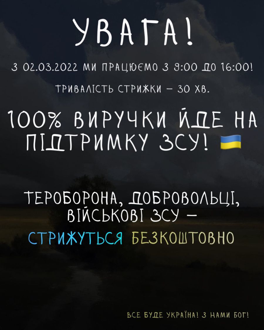 "Ми будемо працювати — і 100% нашої виручки буде надіслано на підтримку ЗСУ!" — йдеться у повідомленні Olden Barbershop.