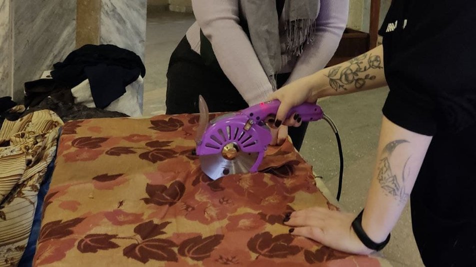 “Ми прийшли з різаком, щоб пришвидшити процес нарізання тканини для маскувальних сіток. Зараз і так роботи немає, тому вирішили допомогти іншим чином”, — розповідає Катерина Герасименко.