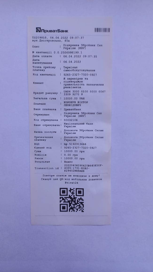 Отримані кошти рятувальник одразу ж перерахував на допомогу Збройним силам України.