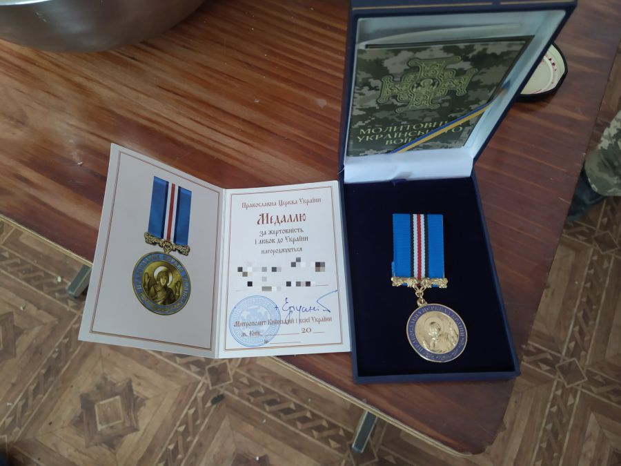 Медаль "За жертовність і любов до України" є відзнакою Церкви за вияв жертовної любові до народу України та самовідданий захист Батьківщини. Вона виготовляється із ювелірної латуні та покривається золотом, інформують "Вікна" з посиланням на пресслужбу 68 окремої єгерської бригади.