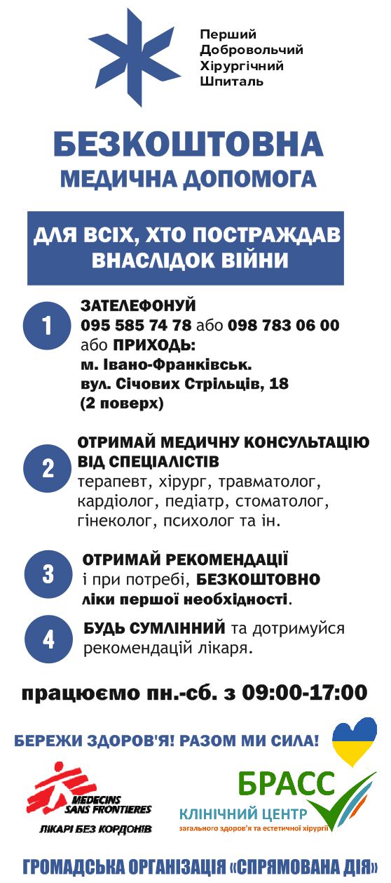 Тут внутрішньо переміщені особи зможуть безоплатно отримати допомогу медиків (терапевт, травматолог, хірург, ЛОР, гінеколог, УЗД), потрібні медикаменти та проконсультуватися з фаховим психологом. Реалізація проекту — це співпраця Громадської організації «Спрямована дія», Міжнародної гуманітарної організації «Лікарі без кордонів» Médecins sans Frontières — Іспанія, клініки «БРАСС» та ініціативи народного депутата Оксани Савчук, інформують "Вікна".