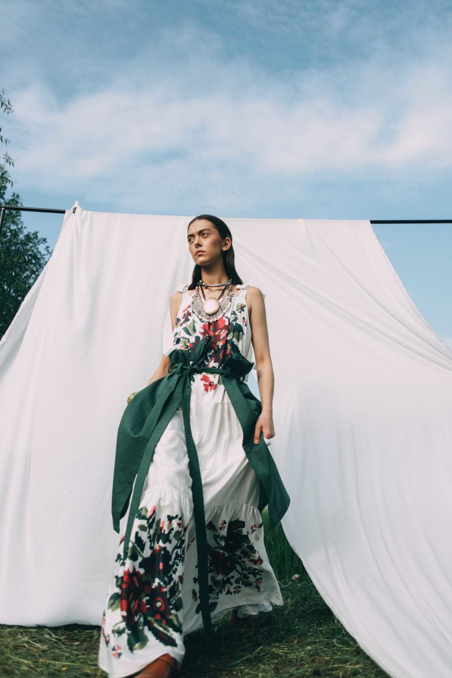 Капсула складається із двох сарафанів вільного фасону в підлогу, широких штанів з лампасами й укорочених топів, які виготовлені з шовку.