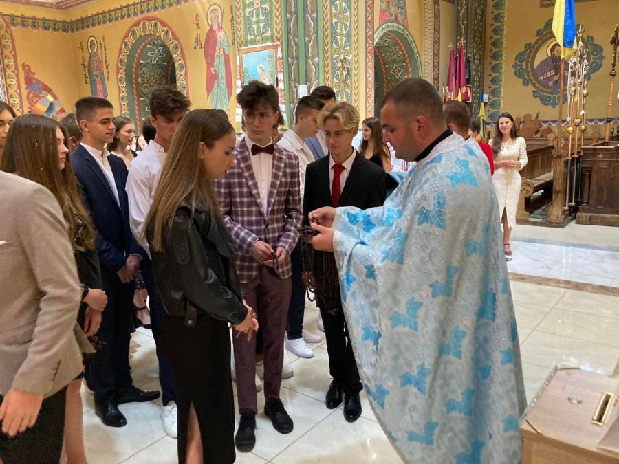 Настоятель храму о. Іван Бігун та сотрудник о. Олександр Марков (молодший) благословили випускників ліцею імені Дмитра Бахматюка, окропили свяченою водою та подарували пам'ятні вервиці з Меджугор'я.