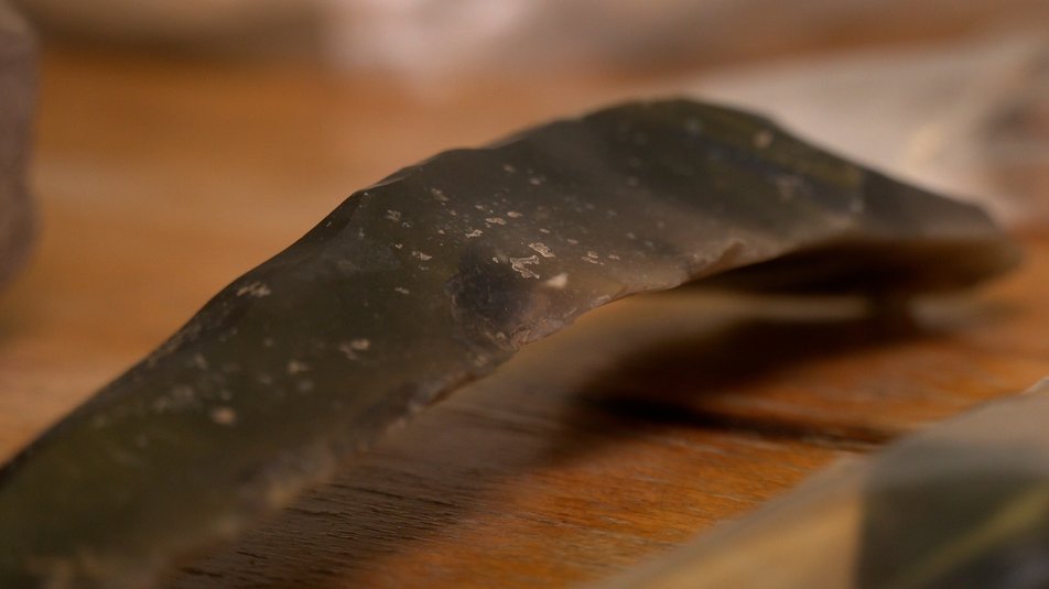 “Такі були великі нуклеуси, ядра, цьому ядру надавалася певна форма, щоб можна було сколоти пластину”, — розповідає Тарас Ткачук.