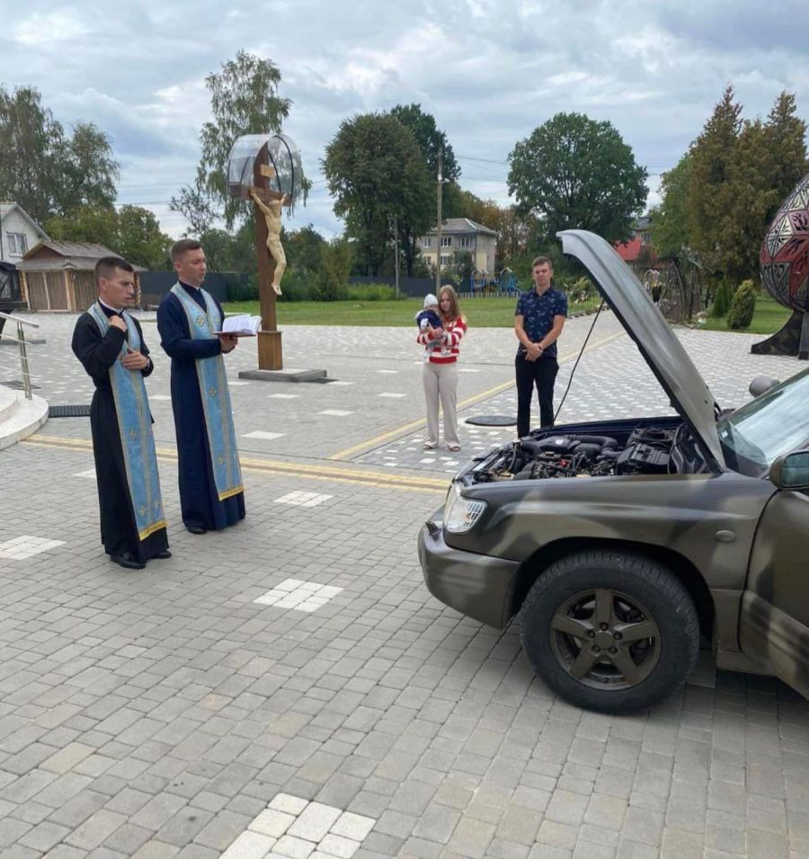 Освятили автомобілі священнослужителі голинської Парафії Покрови Пресвятої Богородиці — о. Микола Хомин та о. Анатолій Козак. Також передали на фронт і вервиці, сухі борщі, каву, чай та макарони.