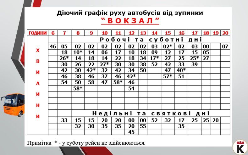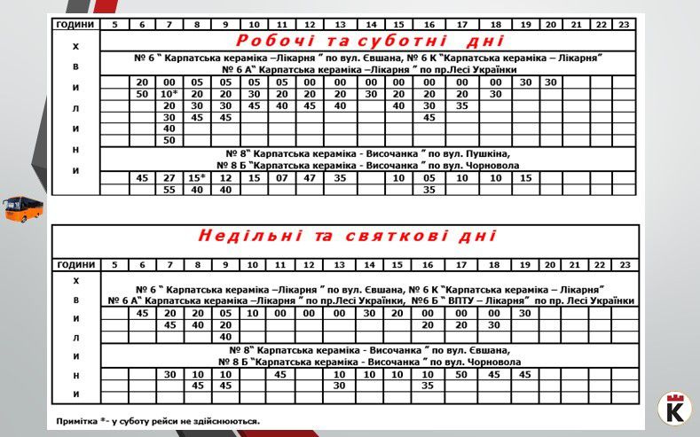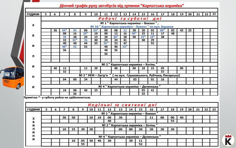 Пропонуємо оновлені графіки руху на місцевих автобусних маршрутах загального користування від початкової зупинки "Карпатська кераміка" та від кінцевих зупинок мікрорайонів міста станом на 20 вересня: