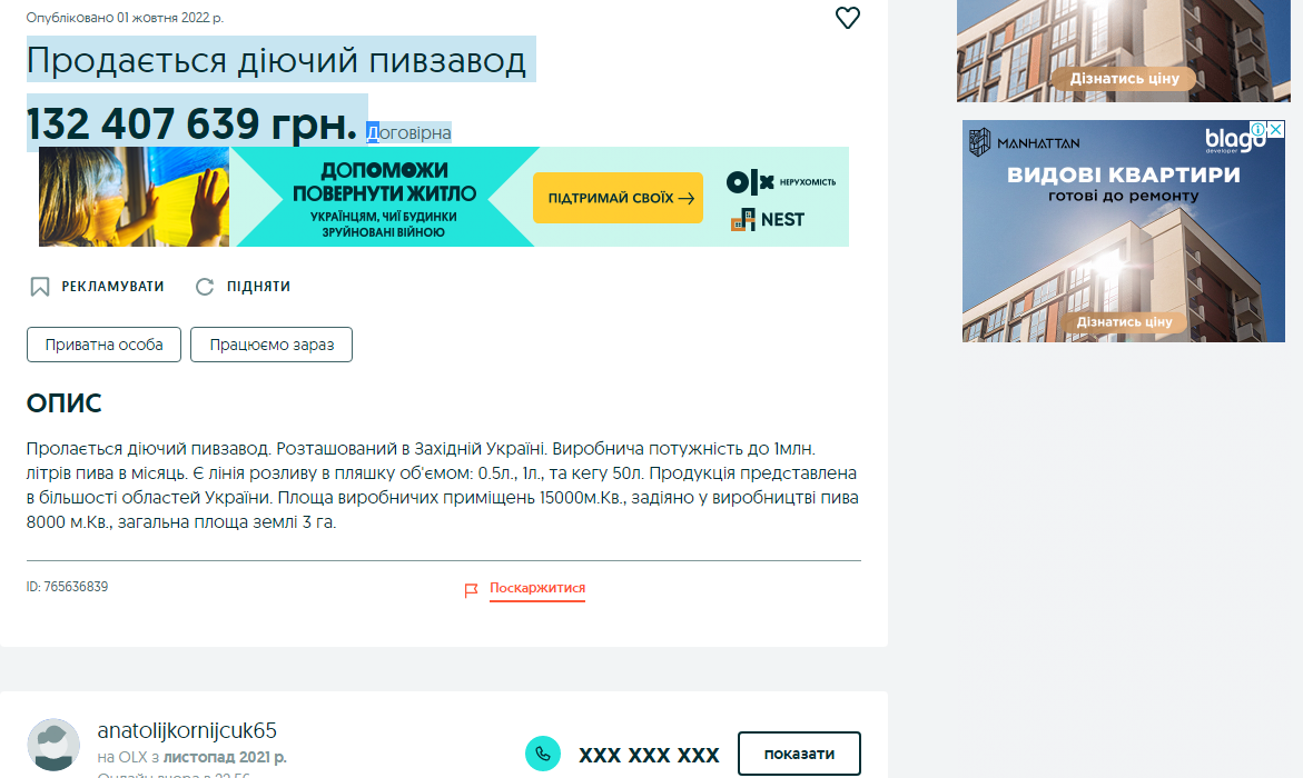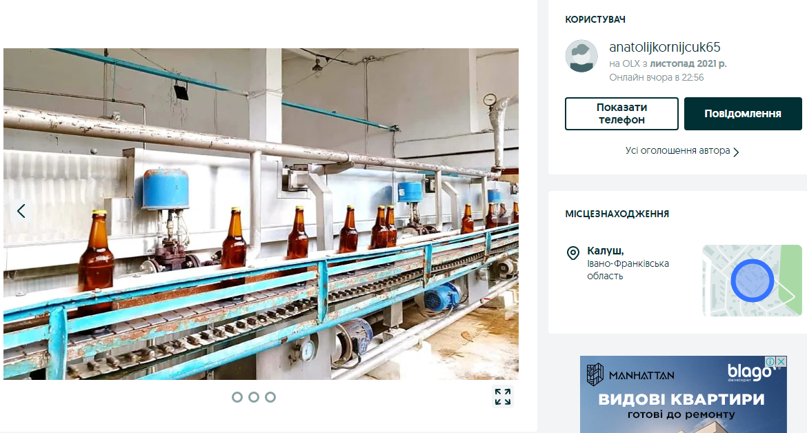 «Виробнича потужність до 1млн літрів пива в місяць. Є лінія розливу в пляшку об'ємом: 0.5л, 1л, та кегу 50л. Продукція представлена в більшості областей України. Площа виробничих приміщень 15000 м. кв., задіяно у виробництві пива 8000 м. кв., загальна площа землі 3 га», — йдеться в описі виставленої на продаж нерухомості.