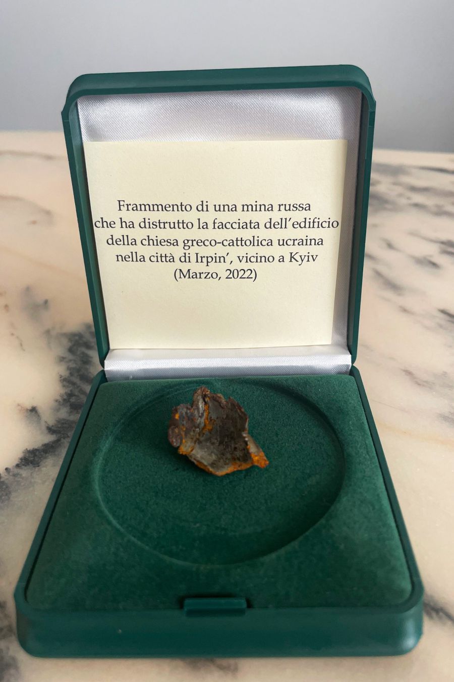 "Наш подарунок Святішому Отцеві Франциску фрагмент російської міни, яка у березні знищила фасад храму УГКЦ в місті-мученику Ірпені — символічний ще й тому, що подібні фрагменти російських мін, бомб та ракет ми щоденно витягуємо з тіл військових, цивільних і навіть невинних дітей. Вони є видимими знаками тотального знищення та смерті, які росія несе на українську землю", — розповів Блаженніший Святослав.