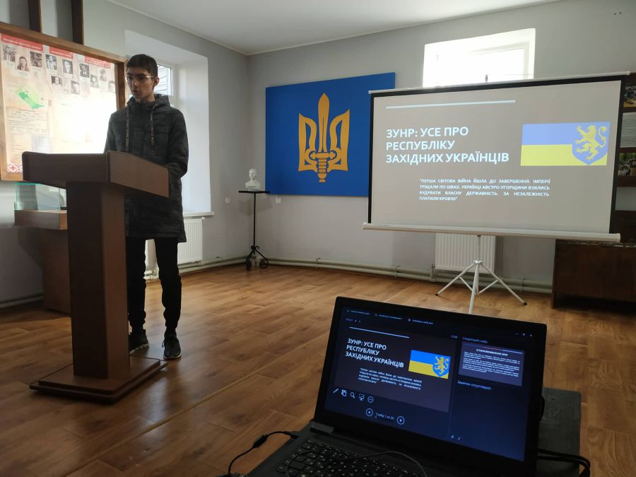 Студент спеціальності «Фінанси та банківська справа» Владислав Довбняк виступив із мультимедійною презентацією «Все про ЗУНР». Опісля — мав можливість відповісти на цікаві запитання учасників заходу.