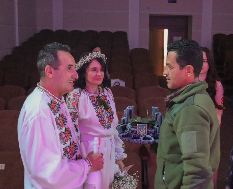 На рушничок щастя стали захисники України Ірина (Діля) та Василь й учасник бойових дій в зоні АТО/ООС Дмитро та його наречена Світлана, повідомив міський голова Андрій Найда.