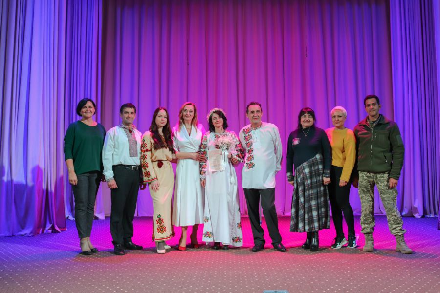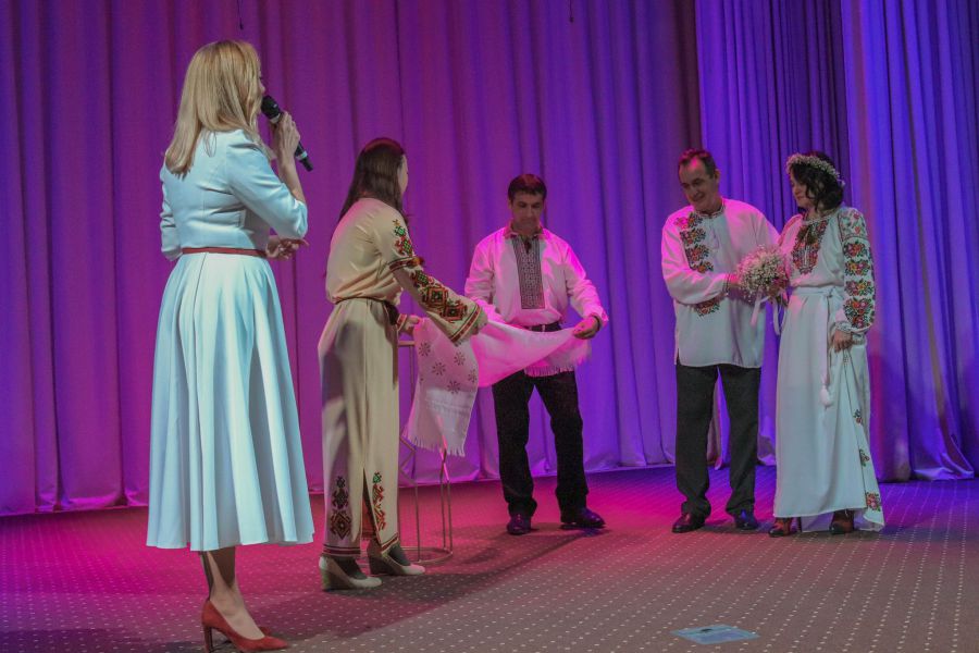 Сюрприз для Дмитра й Світлани влаштували у концертній залі. Їх історію кохання розповідали на сцені актори народного театру «Легенда», учасником якого є наречений. На сцені молодята дали й свої обіцянки вірності.