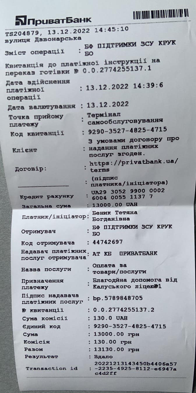 "Вкотре дякуємо всім, хто долучився до збору коштів. Віримо в нашу найшвидшу Перемогу! Бережіть себе, наші захисники і захисниці!", — ідеться в повідомленні ліцею №1.