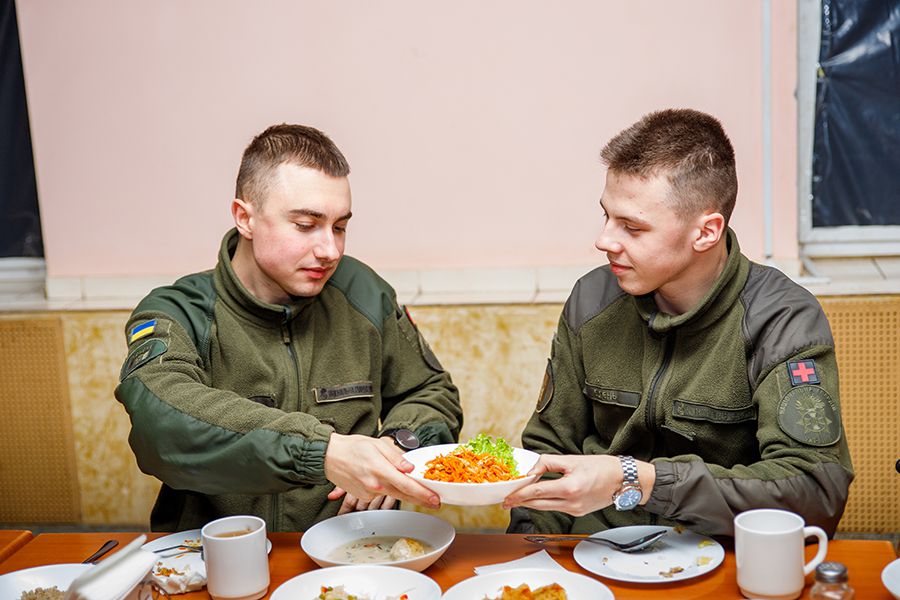 За спільним столом збираються офіцери та строковики, мобілізовані й військовослужбовці за контрактом — усі вони сьогодні ввечері одна велика сім’я. На столі їх чекає багата різдвяна вечеря з дотриманням усіх канонів меню Святого вечора.