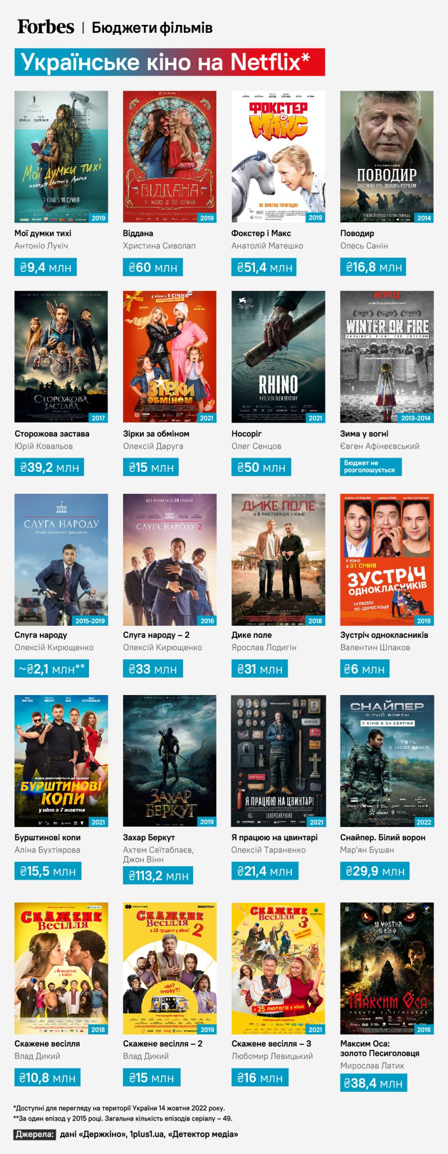 Із Netflix співпрацює і група компаній Film.ua. Восени Forbes стало відомо про продаж великого пакету фільмів стримінгу. Ймовірно, йдеться про 14 проєктів, сказало одне із джерел Film.ua. З них у доступі на стримінгу є одинадцять^ «Поводир», «Захар Беркут», «Мої думки тихі», «Сторожова застава», «Зірки за обміном», «Віддана», «Фокстер і Макс», «Я працюю на цвинтарі» та трилогія «Скажене весілля».