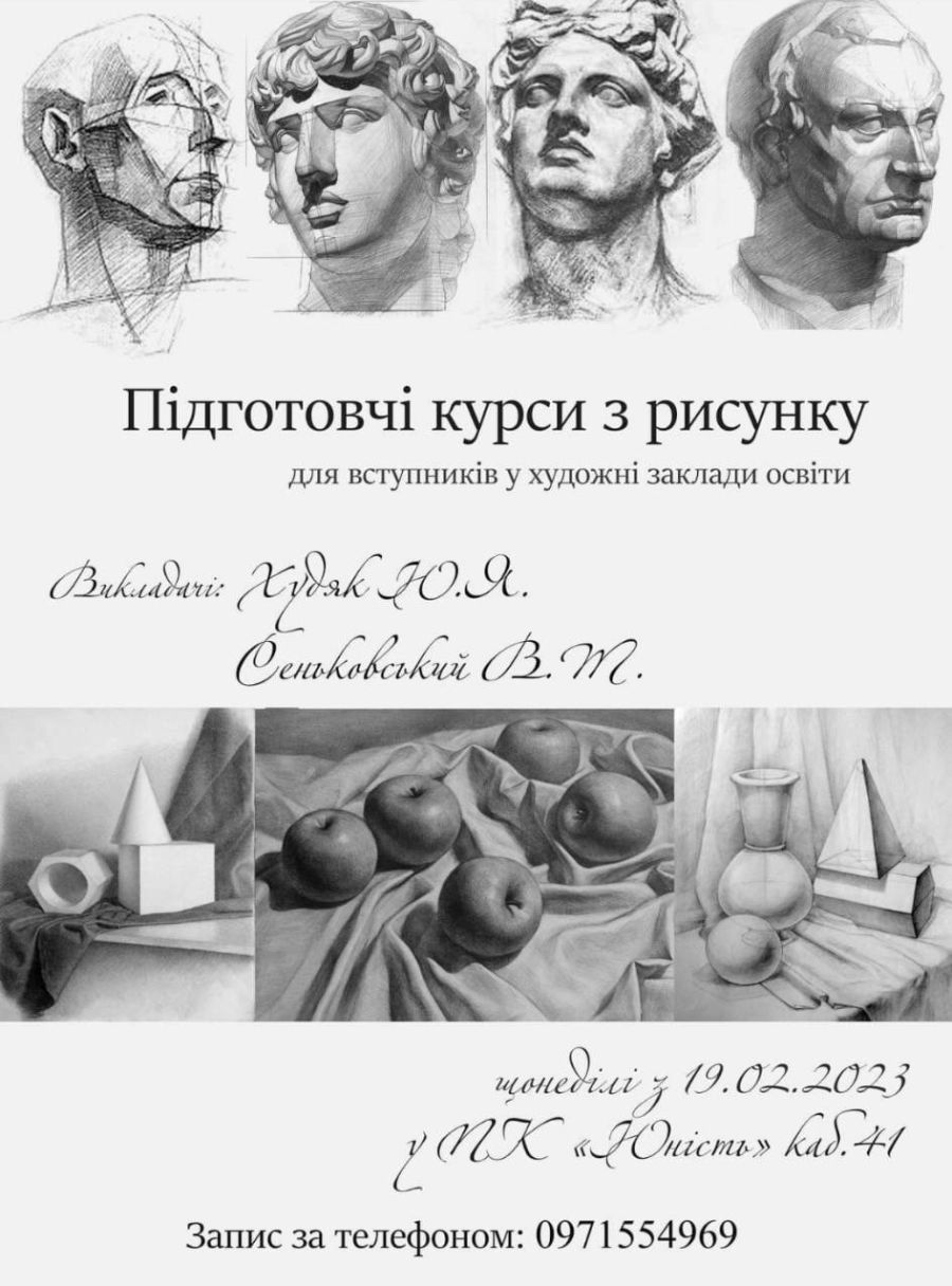 Підготовчі курси з рисунку для вступників у художні заклади стартують з 19 лютого. Запис за телефоном: (097) 155-49-69.