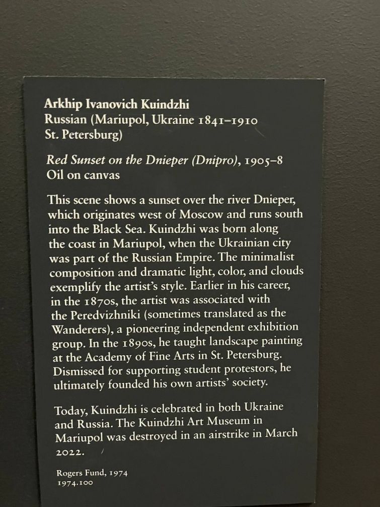 "Куїнджі народився на березі моря в Маріуполі, коли українське місто входило до складу Російської імперії. ...У березні 2022 року російський авіаудар знищив художній музей Куїнджі в Маріуполі, Україна", — йдеться в описі роботи українського художника на сайті Мет.