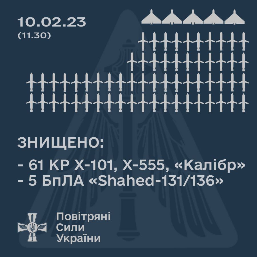 Силами та засобами протиповітряної оборони Повітряних Сил та інших складових Сил оборони України знищено 61 крилату ракету ворога та 5 дронів-камікадзе «Shahed-136/131», про які повідомляли раніше.