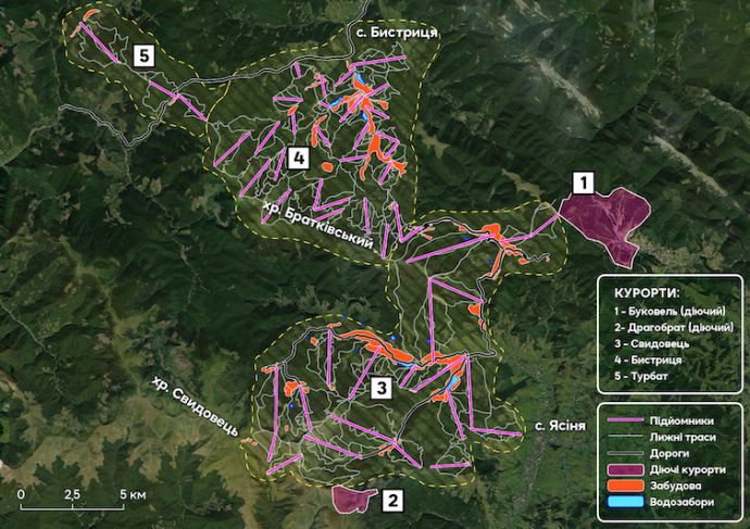 Усі три плановані курорти розміщуються поряд і будуть з’єднані з чинним зараз Буковелем. Тобто в підсумку планується курорт-монстр, розрахований на понад 65 тисяч людей одночасно!