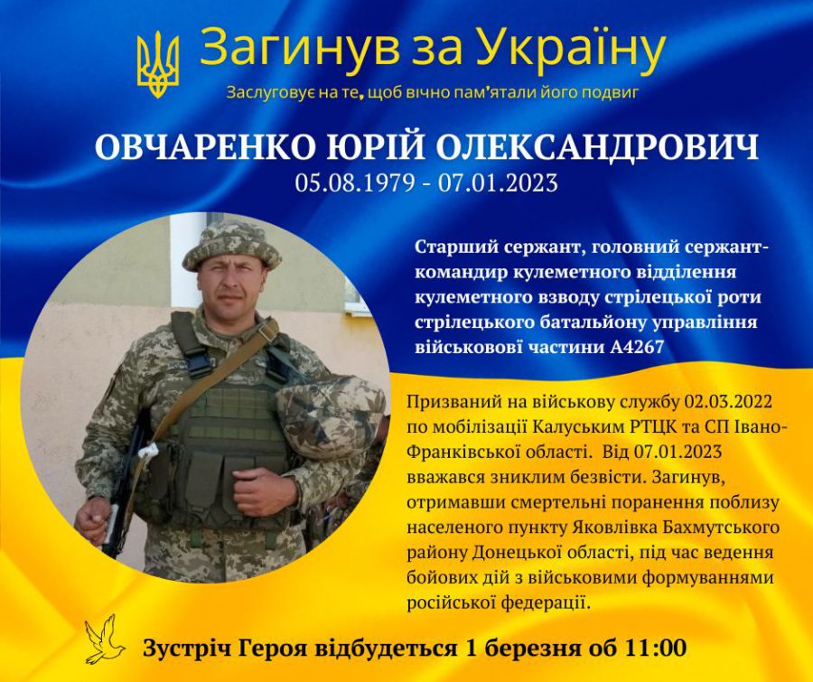 Сьогодні, 1 березня, Долинщина зустрічатиме тіло загиблого Юрія Овчаренка. Скорботний кортеж вирушить від КНП "Долинська багатопрофільна лікарня" (вул. Грицей) орієнтовно об 11:00, йдеться в офіційному повідомленні.