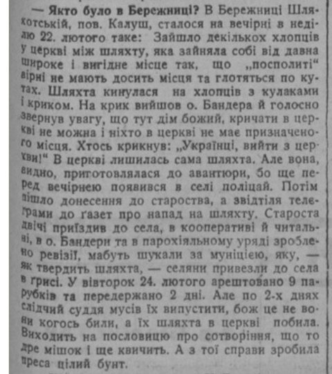 У неділю, 22 лютого 1931 проку, під час вечірньої літургії сталася перепалка між вірянами, декілька українців зайшли до церкви та стали між шляхтичами. Останні не втерпіли образи та накинулися із кулаками на хлопців. На крик вийшов отець Андрій Бандера і голосно звернув увагу, що це дім Божий, кричати в церкві не можна, і ніхто не може мати у храмі визначеного місця.