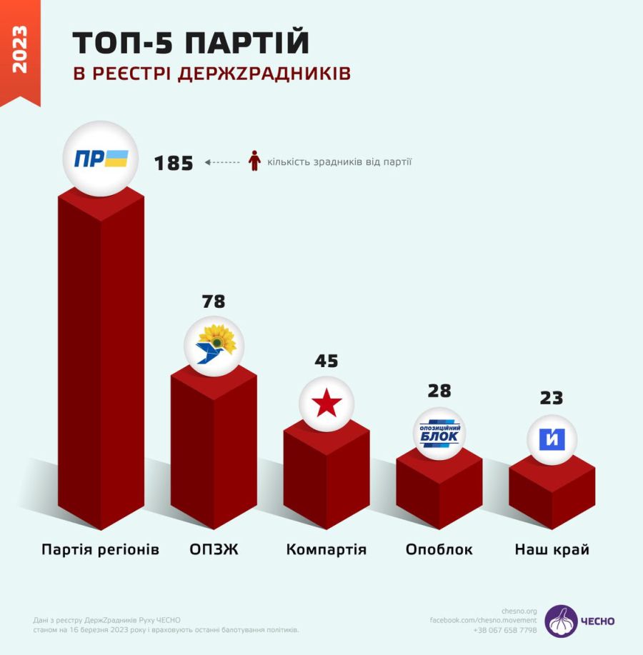 Частина регіоналів після Революції Гідності втекли до росії чи окупованого Криму, а частина заснували такі проросійські партії, як ОПЗЖ та "Опозиційний блок". Саме ці партії посіли другу та четверту позиції за кількістю держзрадників.
