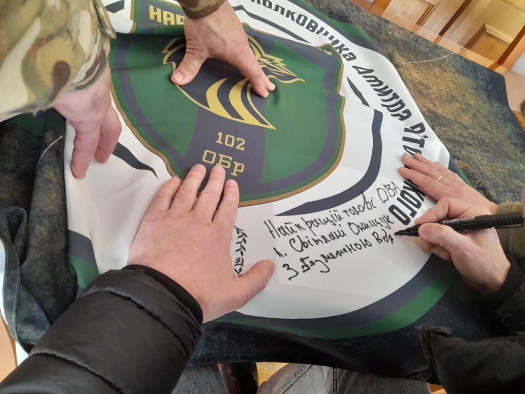 «Сьогодні мені надзвичайно приємно отримати в подарунок прапор 102-ї бригади із підписом наших воїнів. Невпинно продовжуємо підтримувати наших бійців. Сьогодні вони виборюють наше майбутнє.Разом до Перемоги!» — зазначила Світлана Онищук