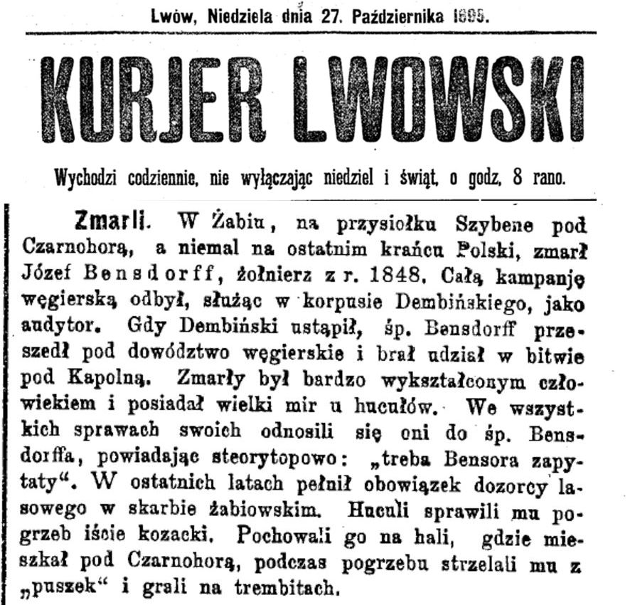 Гуцульщина пам’ятає чимало осіб, які залишили по собі неоціненний відбиток у житті горян. У цьому чудовому краї свого часу оселилися і залишили останній передсмертний слід багато видатних особистостей: краєзнавців, педагогів, будівничих... Узавперш, така тенденція була пов’язана з тим, що на Гуцульщині постійно тривали міграційні рухи під акомпанемент глобалізаційних процесів. Були, звісно, серед цих постатей і такі, що гуцулам в’їдалися у печінки. Але були й прихильні до горян: серед них — Юзеф Бенздорф.