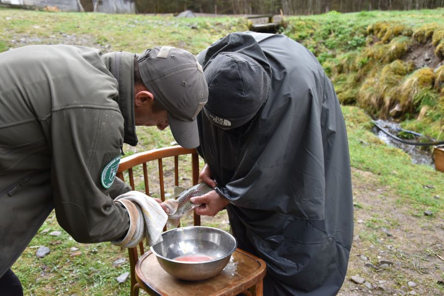 «Доїння проводять дуже обережно та пильно. Стежать за тим, щоб не пошкодити ікринки, які можуть бути дуже крихкими. Неправильно проведений процес доїння може призвести до псування ікри та її втрати. До такої процедури необхідно заздалегідь бути готовими й підготувати окремі нерестові басейни. Насамперед для цього потрібно визначити стать, куди поміщають відібраних самок і самців, мати необхідне інкубаційне обладнання, а головне — вміти акуратно доїти ікру, правильно здійснювати запліднення, а далі рибоводам регулярно працювати з личинкою, мальком, рибоносним матеріалом», — говорить начальник Синевирського природоохоронного науково-дослідного відділення Василь Сятиня.