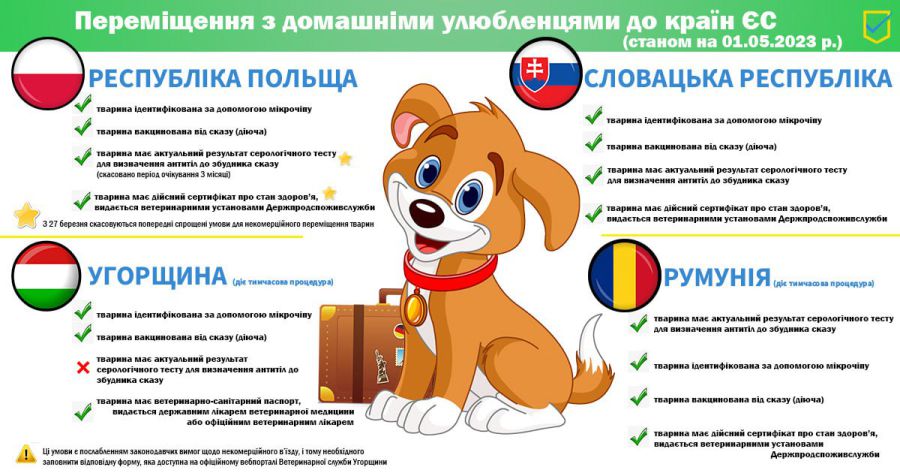 Поточні вимоги до некомерційного переміщення тварин на територію країн ЄС, що межують з Україною станом на 01.05.2023 р., відображені на інфографіці.