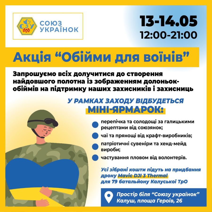 "Запрошуємо краян долучитися до акції “Обійми для воїнів”. Ми пропонуємо створити найдовше панно із зображенням долоньок-обіймів на підтримку наших військових. Запрошуємо і дорослих, і дітей, щоб підтримати армію та одне одного. Приходьте, будемо спілкуватися, обійматися та передавати обійми нашим мужнім захисникам і захисницям. І всі разом долучимось до благодійного збору!", — йдеться в повідомленні.
