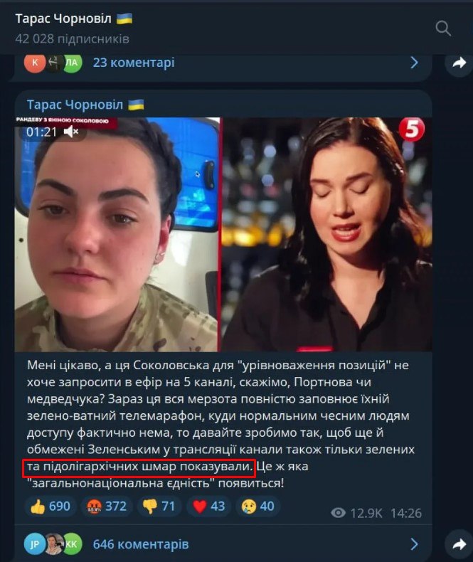 Син видатного українського політичного діяча В'ячеслава Чорновола — Тарас 29 травня опублікував допис у своєму телеграм-каналі з фрагментом інтерв'ю Аліни Михайлової українській журналістці Яніні Соколовій, де обурився, що нібито «зелено-ватних мразот» запрошують на передачі, а «чесним людям» і слова не дають сказати. Невдовзі цей допис Чорновіл видалив і заявив, що до нього у коментарі приходять люди з погрозами.