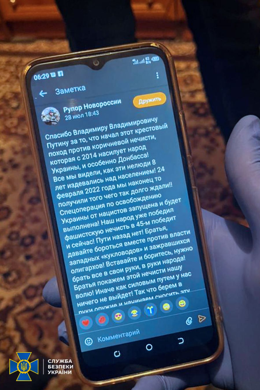 Крім того, агітатор захоплювався вищим керівництвом рф та його ставлениками на окупованих територіях, героїзував російських вояків. Натомість українців називав «коричневою чумою».
