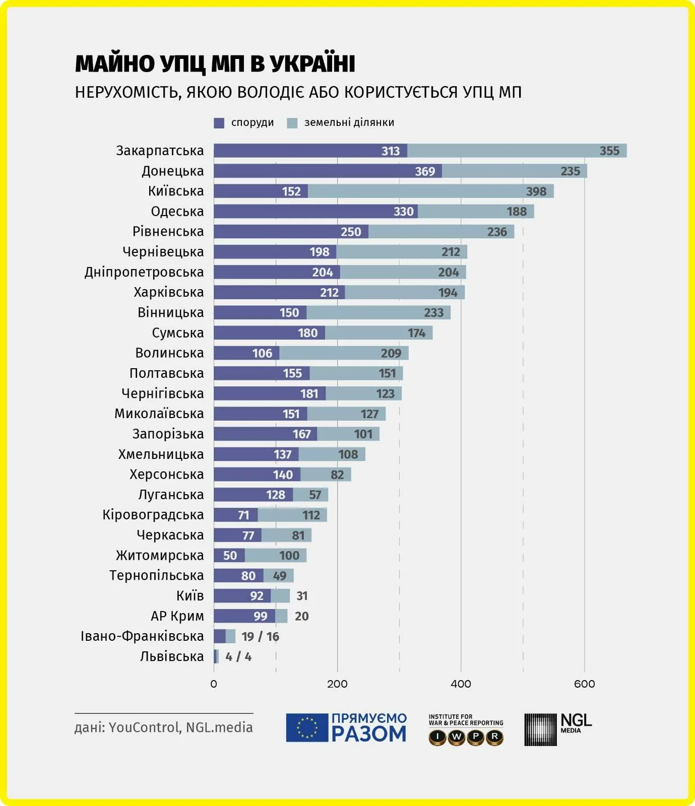 Проте УПЦ МП як сукупність тисяч організацій володіє не лише власним майном, але й державним чи комунальним, переданим в оренду чи користування. Саме це майно порівняно легко можна було б вилучити. Тому NGL.media разом з YouControl зібрали інформацію про усю нерухомість, зареєстровану на УПЦ МП в Україні. Усі дані взяті з держреєстрів станом на травень 2023 року», — йдеться на сайті антикорупційного центру.
