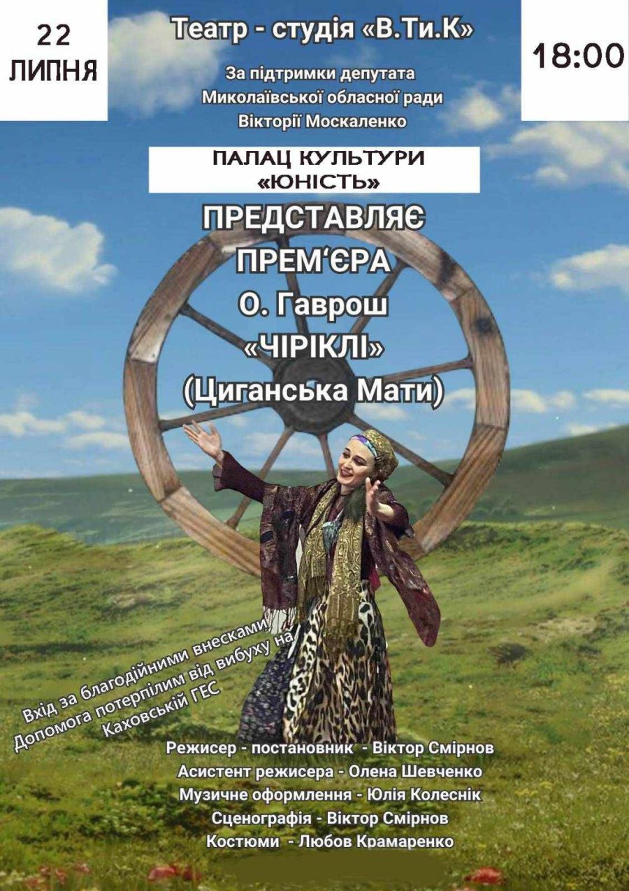 У суботу, 22 липня, у Калуші покажуть виставу «Чіріклі» (Циганська мати) у постановці молодіжного театру «В.Ти.К» із Миколаєва. Театрали приїдуть на запрошення театру молоді «Silentium». Вистава про життя закарпатських ромів на основі комедії Олександра Гавроша цьогоріч перемогла на театральних фестивалях «День театру 2023» і «Від Гіпаніса до Борисфена», інформують "Вікна" з посиланням на Калуську міську раду.