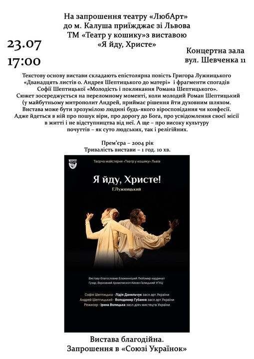 У неділю, 23 липня, у Калуш на запрошення молодіжного театру «ЛюбАрт» приїде «Театр у кошику» зі Львова. Представлять виставу «Я йду, Христе!». За основу постановки режисерка Ірина Волицька взяла епістолярну творчість митрополита Григора Лужницького «Дванадцять листів о. Андрея Шептицького до матері». У фокусі — період, коли тоді ще Роман Шептицький прийняв рішення піти духовним шляхом.